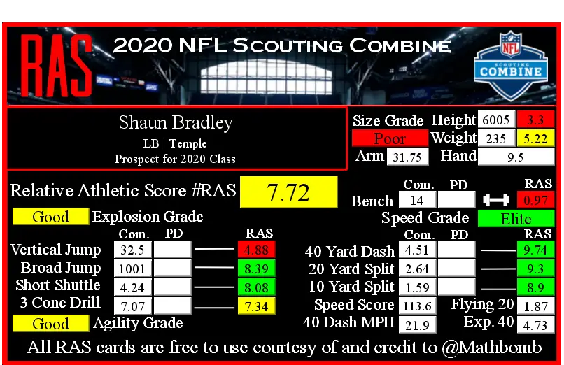 He recorded a Relative Athletic Score of 7.74, out of a possible 10.0. RAS is a composite metric on a 0 to 10 scale based on the average of all of the percentile for each of the metrics the player completed either at the Combine or pro day.